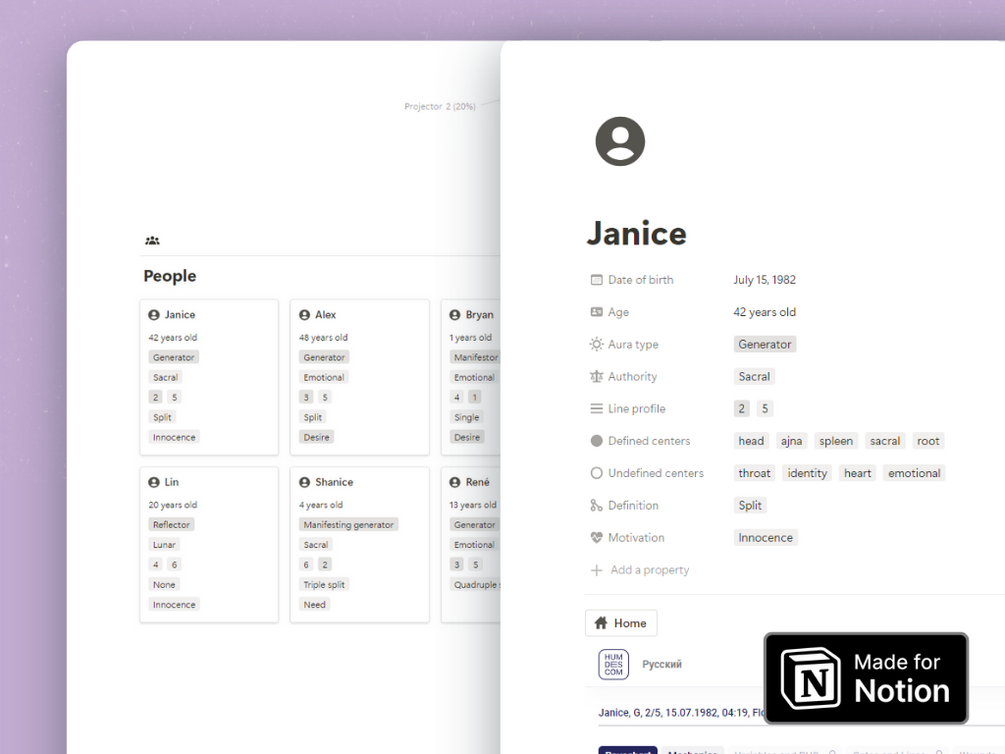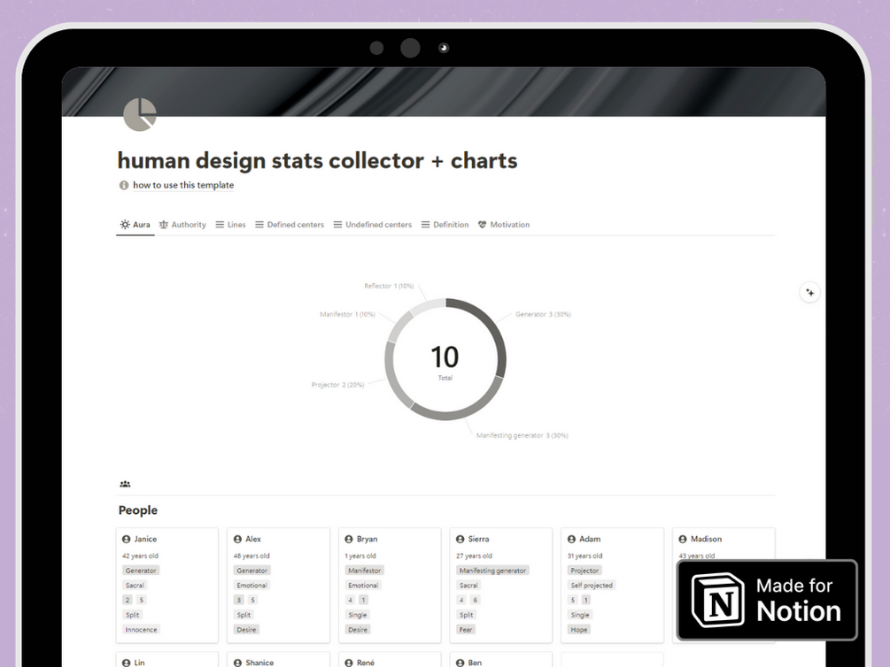 I needed to keep track of all the people in my sphere - my family, friends, clients - and as a Notion Ambassador I had to make something in Notion to help me keep track. So if you're also experimenting with Human Design and want to keep track of everyone, here's a template for you!